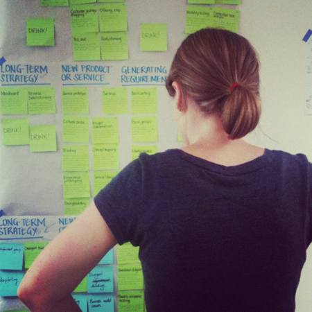 For the activity we first divided into three groups. Each group was given a pile of 20 design research method cards (on stickies). In our groups we had to place each of the design methods into a job category. These categories cover some of the types of projects Meld is working on at the moment: Long-term strategy; Understanding users; Designing a new product or service; or Generating requirements.